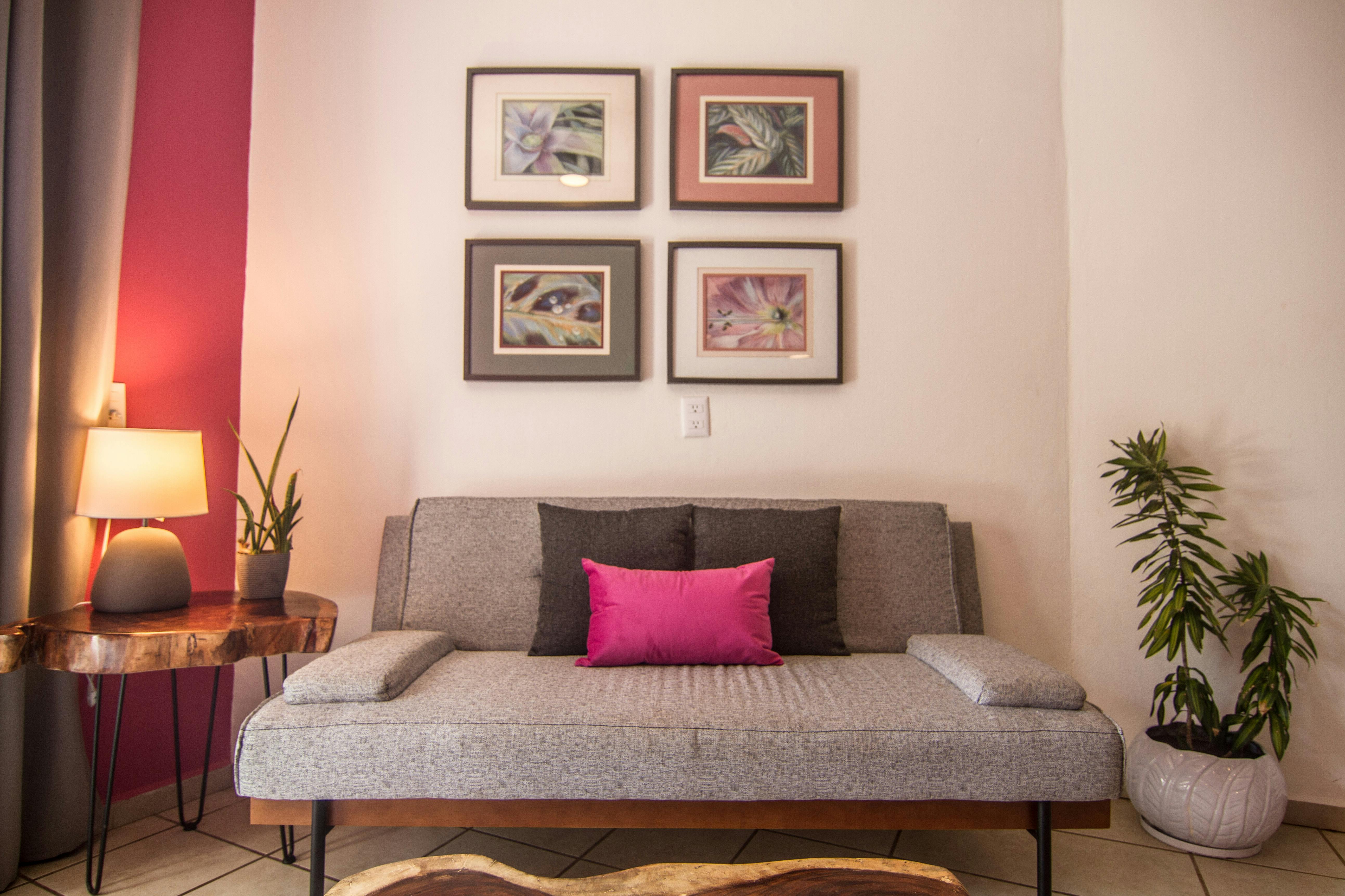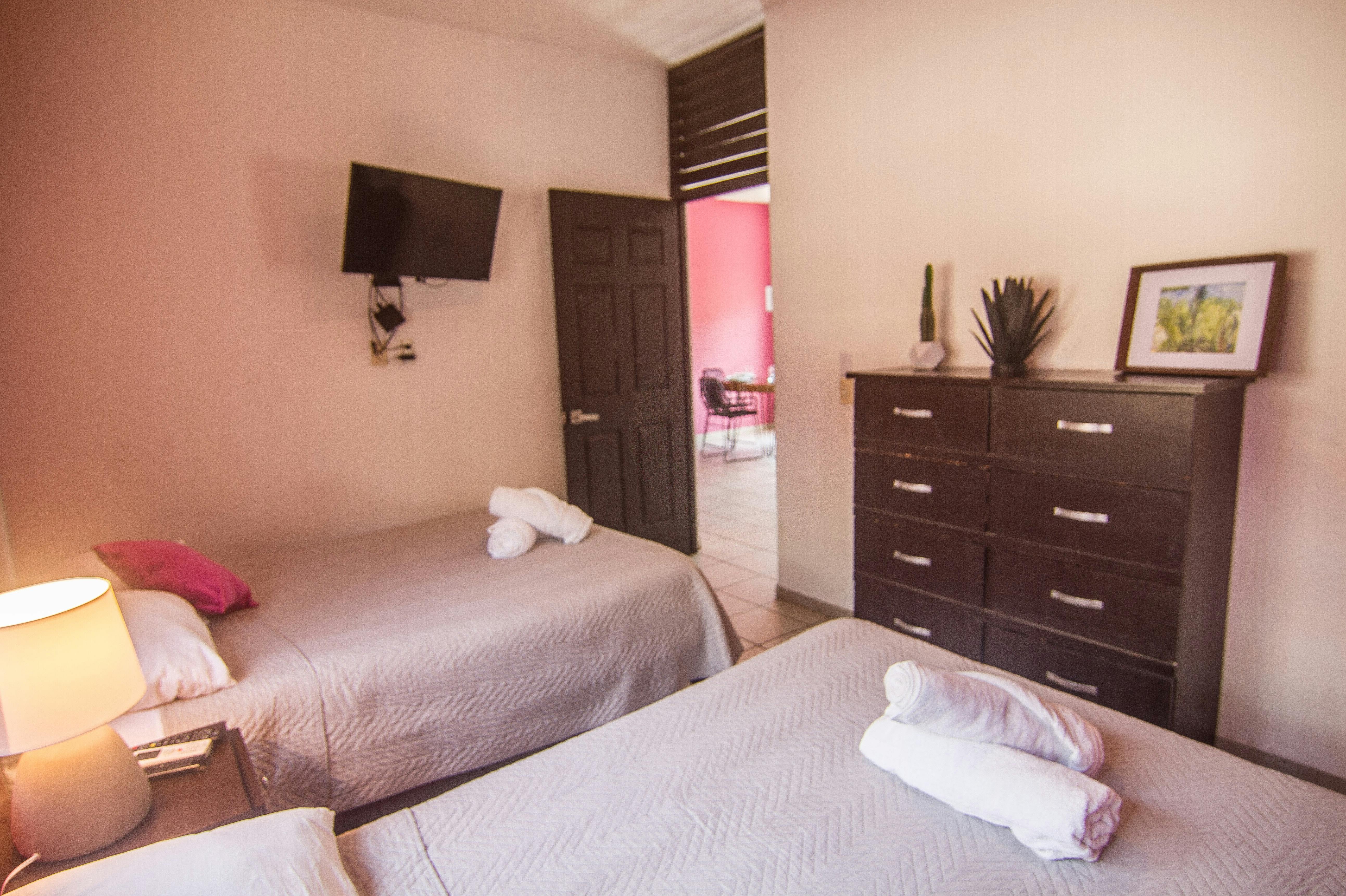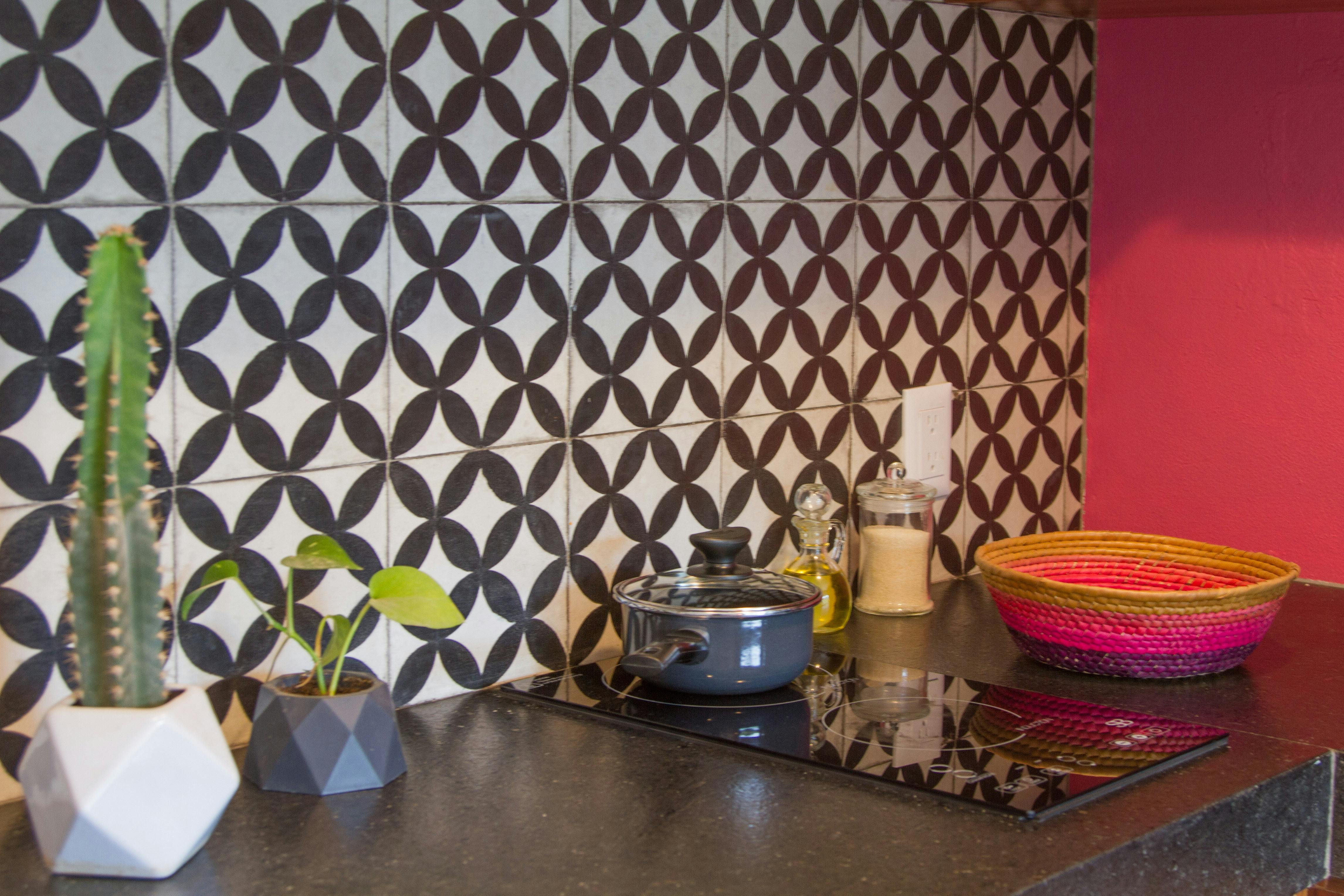 Todos los precios son en pesos. ¡Bienvenido a nuestra recién renovada Villa 2! Con un divertido diseño mexicano moderno, puede relajarse en estilo y comodidad. Ubicadas en el nivel principal, nuestras villas de una recámara comparten un balcón con vista al área de la alberca. Cada villa cuenta con mucha luz natural, gracias a las grandes puertas corredizas de vidrio. Villa 2 tiene 2 camas matrimoniales en la recámara y un sofá cama individual en la sala. Hay una televisión inteligente montada en la pared de la recámara. Disfrute de una deliciosa comida preparada en su propia cocina con placa de inducción de 2 quemadores, microondas y refrigerador. Todas las villas también tienen tostadoras y licuadoras además del equipo estándar de la cocina, así como platos, vasos y cubiertos. La nueva renovación incluye mosaicos personalizados en la cocina y el baño, así como encimeras de granito y nuevos accesorios de plomería en todo el espacio.