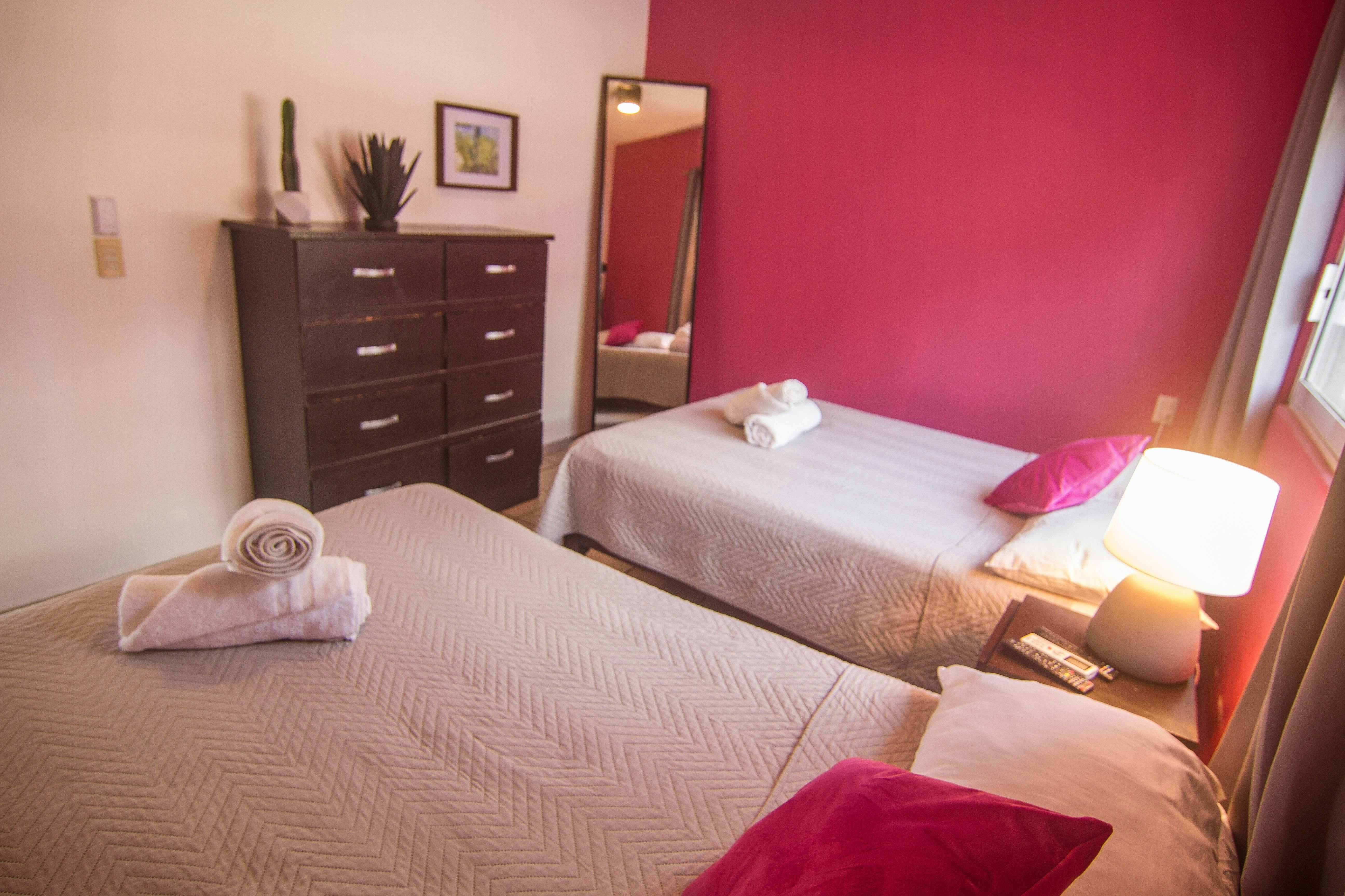En la recámara hay 2 camas matrimoniales, espacio para guardar sus pertenencias y televisión.