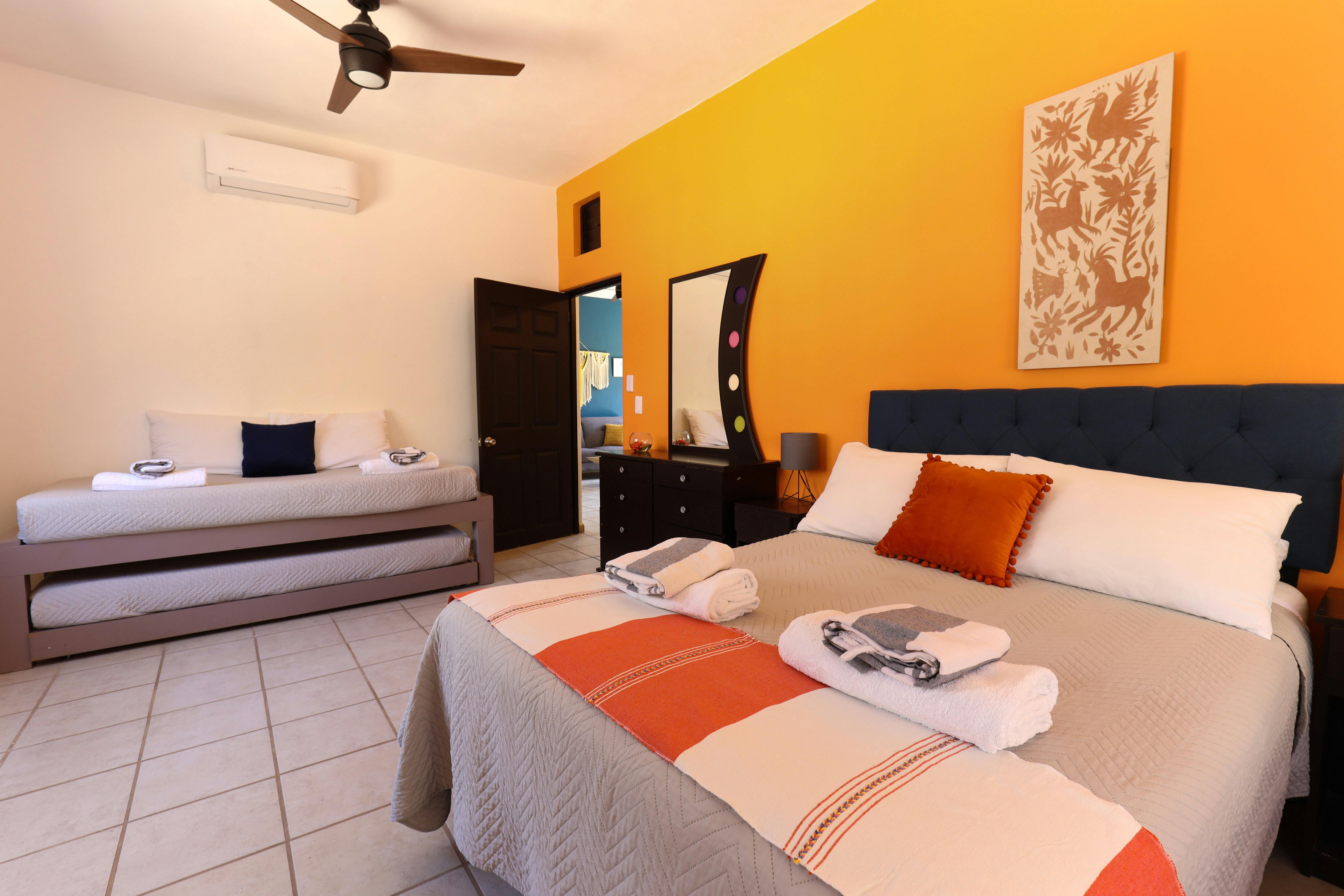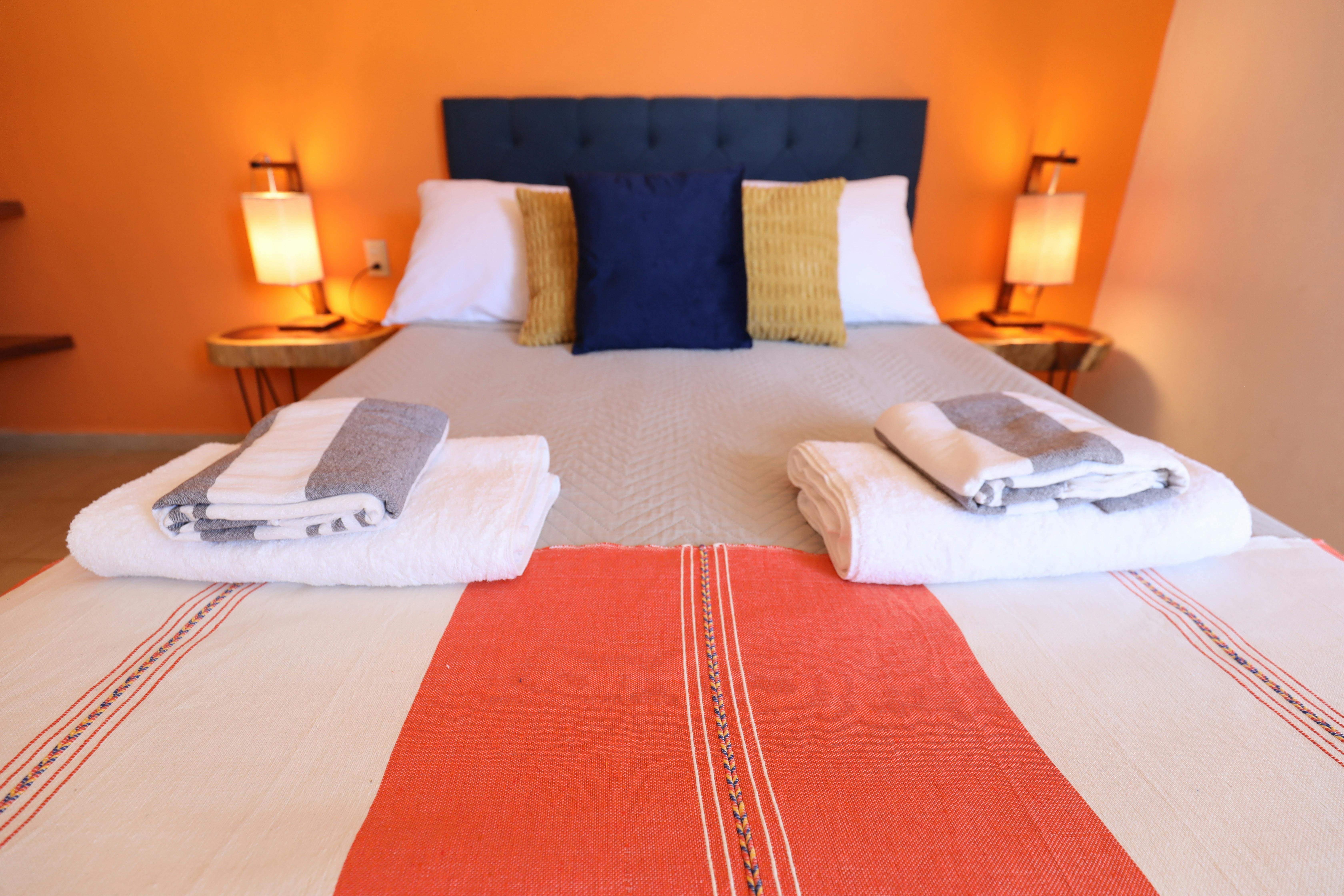 All prices are in pesos. Welcome to Villa 5! Newly renovated with granite counters, parota cabinetry and custom design details, Villa 5 is a feast for your eyes! This two bedroom, one bath villa is located on the second floor of the building, accessed by central staircase. As with all of our villas, Villa 5 have a small kitchen with dining area and living space. Each Villa is also equipped with a private bath and stocked with fluffy towels, Turkish towels to take to the beach and basic toiletries.