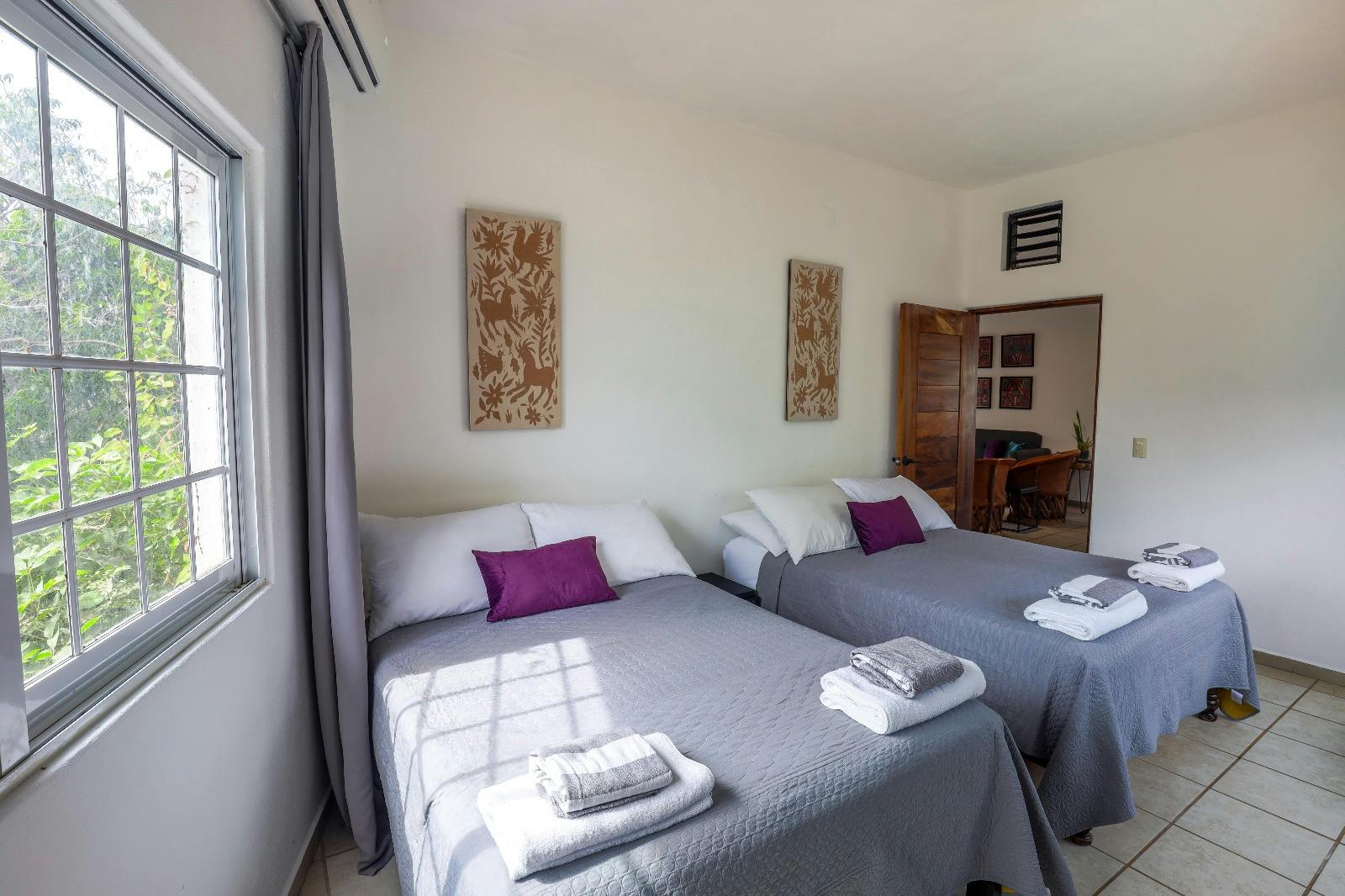 All prices are in pesos. Our smaller 2 bedroom villa still has room for the family! The larger bedroom has 2 matrimonial sized beds with comfy mattresses and all linens provided. The front bedroom has a matrimonial bed and opens directly on to your Villa's private balcony, an individual bed is tucked away underneath and can be rolled out when needed.